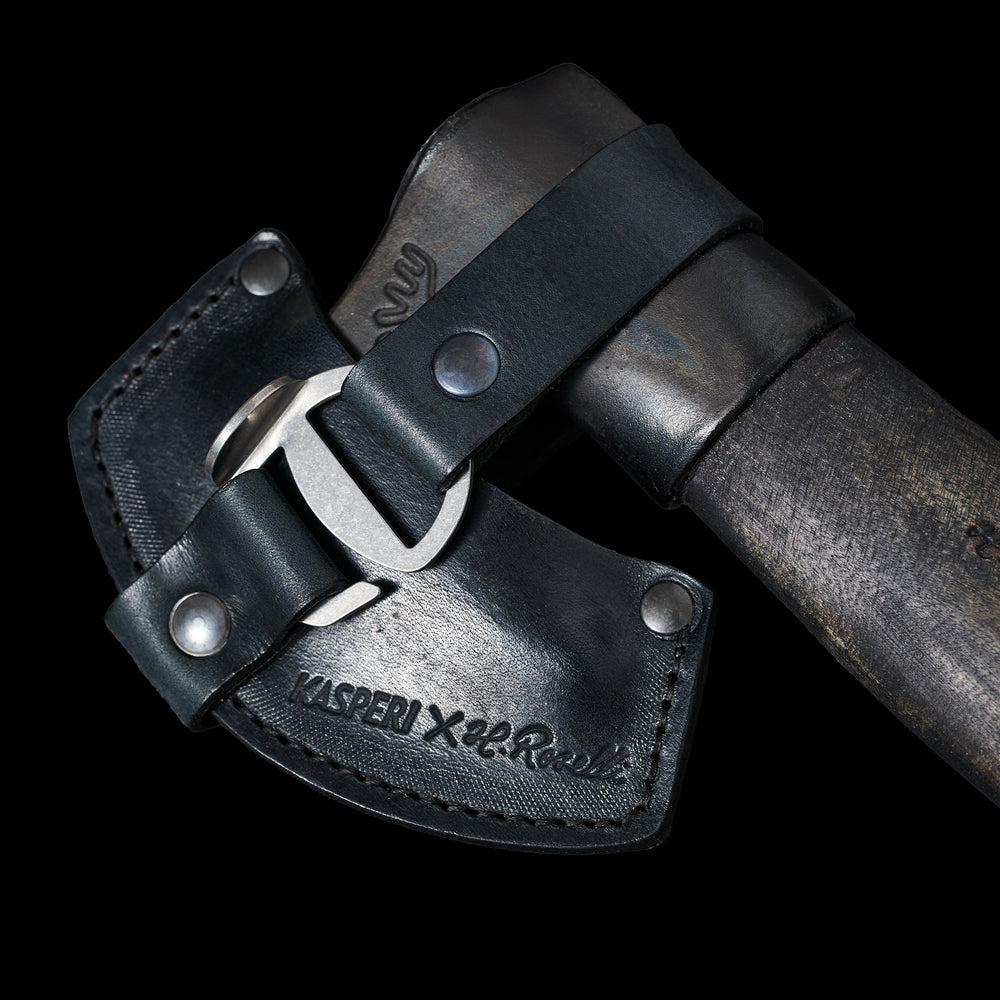 - La hache est conçue pour s'attacher à la Kasperi Fold Top avec une paire de Sangles en cuir.