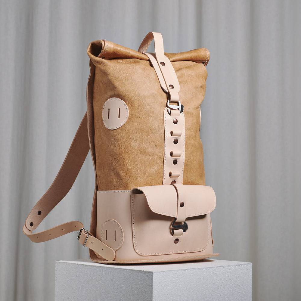 2020年春に、最初のwhitetail鹿パックを作りました。番号付きで限定されたmoss green Specials S.03です。そのパックは人気があり、私たちはそれをmoss green whitetail Fold Topとして復活させました。その後、2020年にS.04を開発し、2021年春に発売しました。さまざまなバージョンのwhitetailレザーFold Topを試す中で、フィンランドのAhlskogなめし工場からのnatural whitetailレザーとカタルーニャのSplendaなめし工場からのIvory植物タンニンでなめした牛革を使用して、唯一無二のFold Topを作成しました。