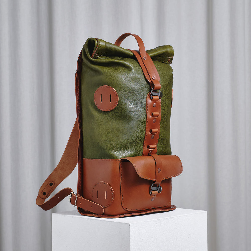The body of the pack is made from the sturdy Italian Puccini tannery's vegetable-tanned bovine leather and the folding part is made from the Italian Virgilio tannery's supple and lasting vegetable-tanned bovine leather in olive green. The combination creates a sharp yet subtle toned backpack. This all makes for a rugged yet classy look, no matter the environment.